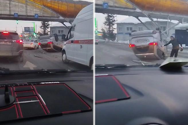 Автомобиль Mitsubishi Outlander перевернулся на крышу возле поста ГАИ. Видео с места аварии опубликовано в Telegram-канале «АвтоБердск-плюс».