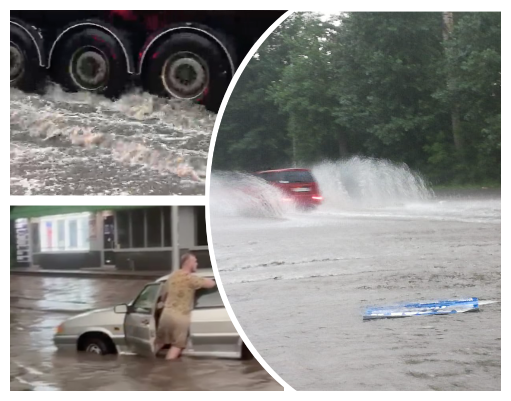 На улице Курчатова машины едва проезжают сквозь мощные потоки воды. Некоторые горожане идут вброд, чтобы преодолеть огромные лужи.