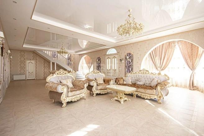 Дом находится в селе Новокаменка и имеет общую площадь 590 квадратных метров. При коттедже имеется участок площадью 12 соток. В доме обустроены пять спален и детские комнаты.