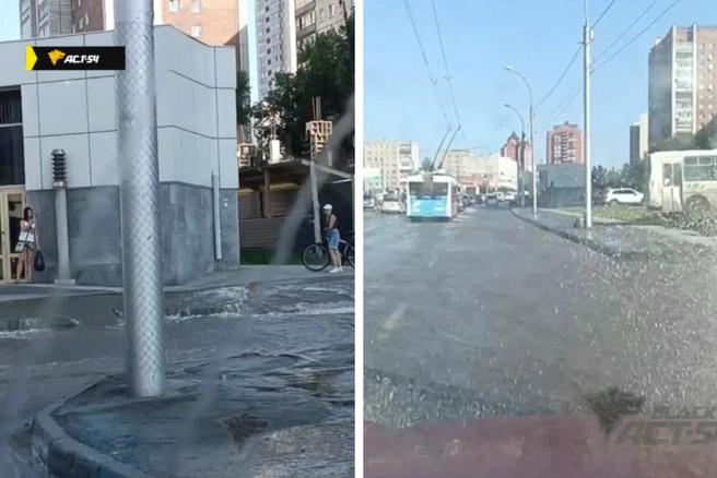 В Новосибирске на улице Кошурникова из люка на тротуаре забил фонтан воды.