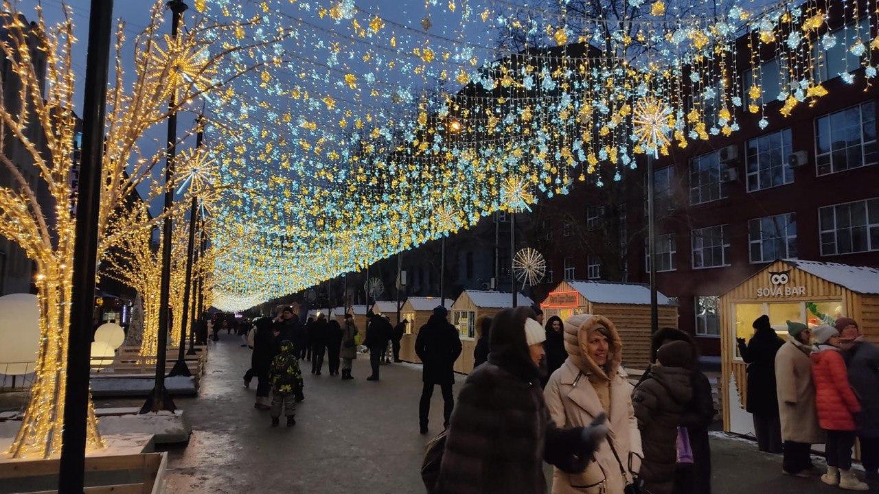 Обилие светящихся украшений помогает запечатлеть эмоциональные моменты на фото, без вспышек и дополнительного освещения. А запечатлеть есть что. У самого входа светодиодная арка, над улицей жëлтым и голубым переливаются подвески гирлянд. Рестораны улицы изменили вывески и фасады под новогодний стиль. Внутри улицы ряды лавок любимых кафе и подарочных магазинов города. Кругом зимние арт-объекты и фотозоны. По соседству нарядный ресторанный дворик и Первомайский сквер, в котором каждое дерево обвивается жëлтыми гирляндами и светильниками-снежинками. Вот так в центре Сибири появился свой новогодний Арбат. И он просуществует вплоть до февраля.