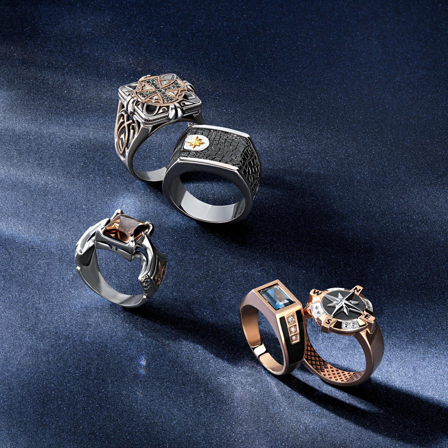 Одно из самых распространенных и традиционных мужских украшений. Обручальные кольца, печатки, перстни — каждый из этих видов имеет свою историю и символику. Мужчины выбирают кольца из различных металлов — от классического золота и серебра до более современных титана или вольфрама. Дизайн колец также варьируется от строгих геометрических форм до более сложных узоров и инкрустаций.
