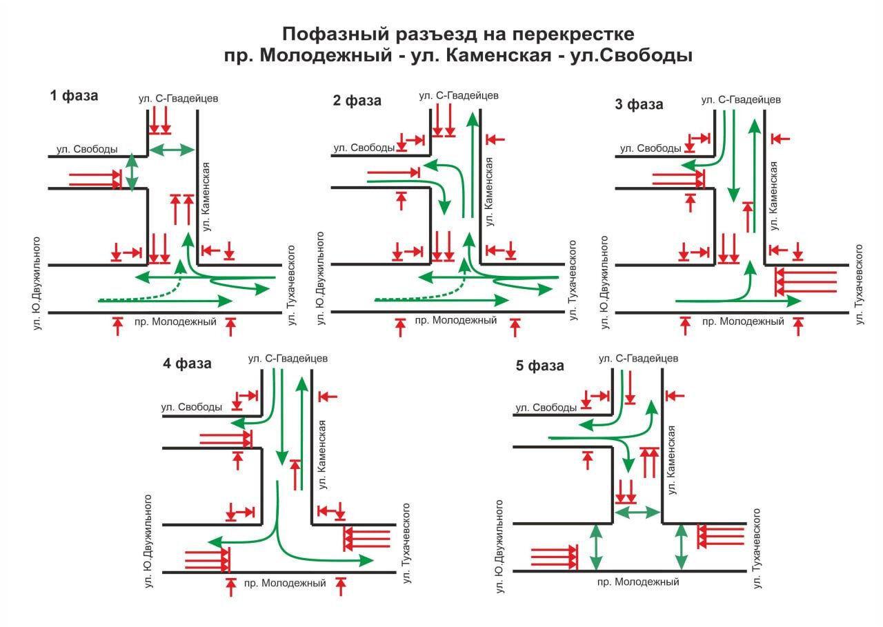 Первый этап: Движение автотранспорта по проспекту Молодежному в обоих направлениях, параллельно разрешено движение пешеходов через улицы Свободы и Каменскую.