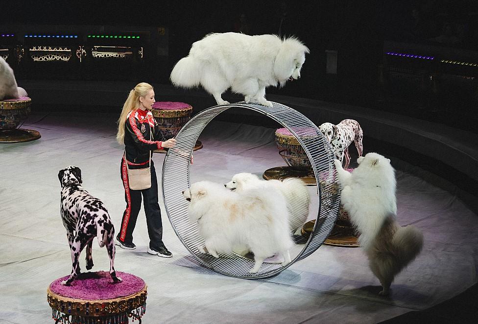 «Дима, смотри: чтобы животные в финале убежали за кулисы, тебе надо встать вот здесь и громко, чётко хлопнуть два раза. Я ухожу, а ты хлопаешь. Договорились?» — говорит Екатерина Запашная мальчику лет десяти. Не очень уверенно, но очень старательно он выполняет команду -и вот уже 8 самоедов и 2 далматина срываются со своих тумб и стремительно летят к кулисам, а на лице мальчишки расцветает счастливая улыбка.