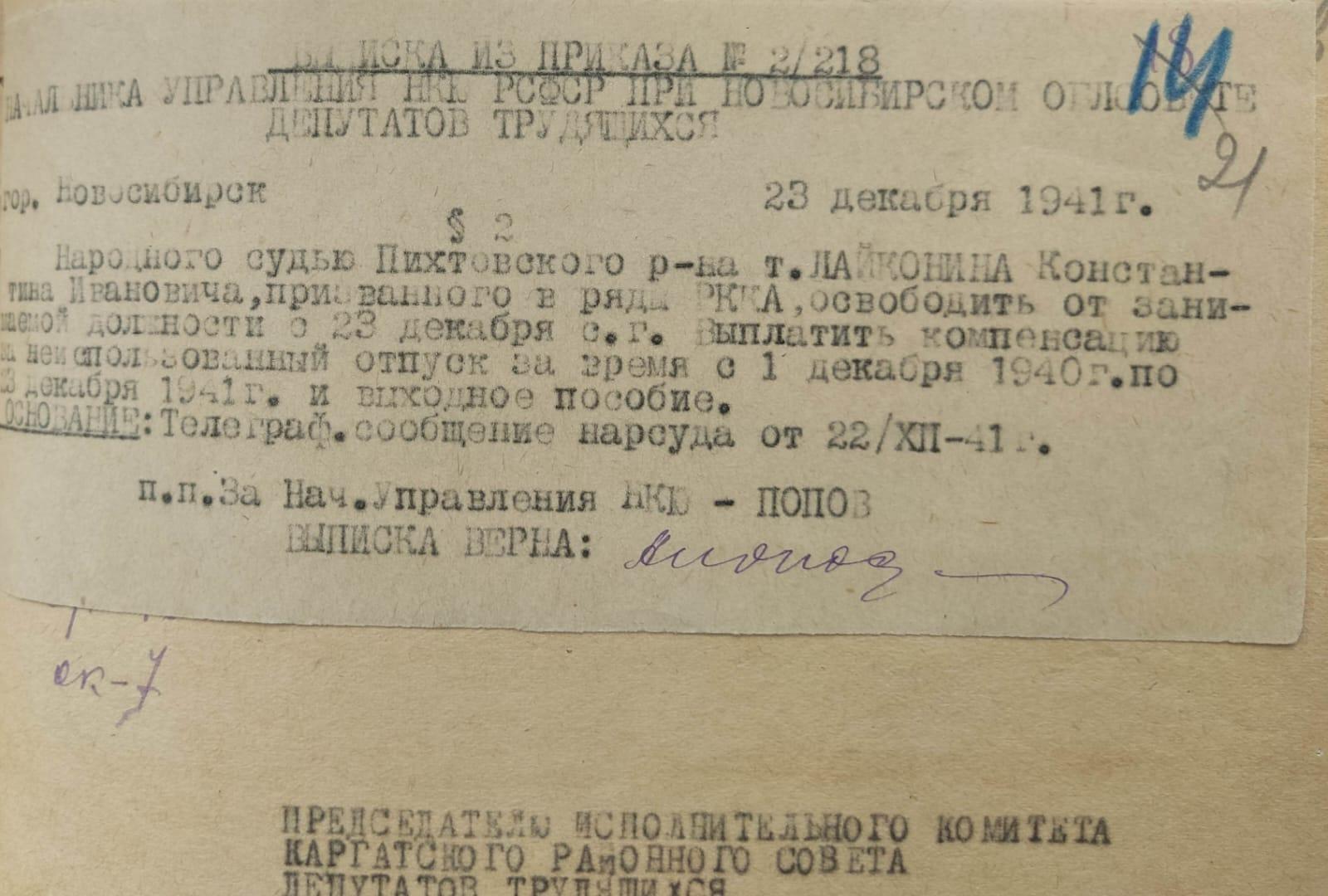Лайконин Константин Иванович до войны работал народным судьей в Новосибирской области. Мобилизован в армию в декабре 1941 г.