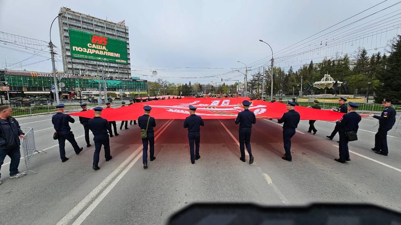 Во время репетиции парада, посвящённого 80-летию Победы в Великой Отечественной войне, в центре Новосибирска было развернуто огромное Знамя Победы.