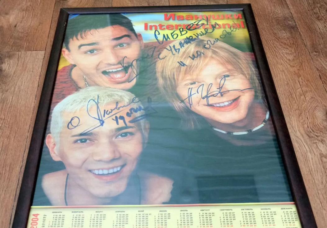 В Новосибирске на площадке Avito появилось необычное предложение для поклонников российской поп-группы — календарь с автографами всех участников коллектива "Иванушки International" в деревянной рамке под стеклом.