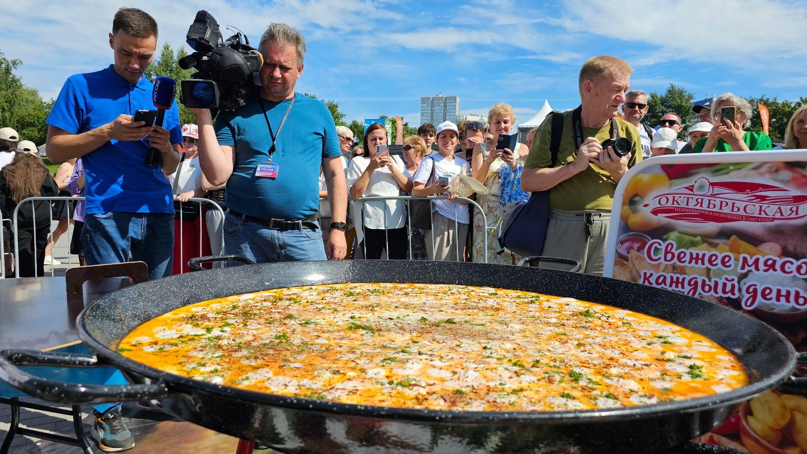 Приготовила внушительный завтрак команда специально приглашенных поваров. Диаметр сковороды составил 1,2 метра. Всего было пожарено 500 яиц.