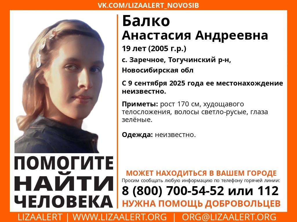 Пропала 19-летняя Анастасия Балко, которая проживает в селе Заречное (Тогучинский район), с 9 сентября 2025 года ее местонахождение неизвестно.