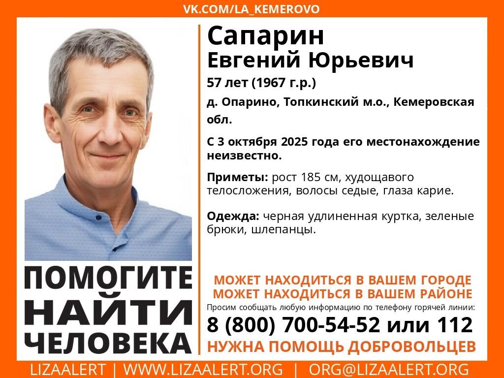 Вторые сутки в Новосибирске ищут 57-летнего Евгения Сапарина из деревни Опарино Топкинского округа (Кемеровская область).