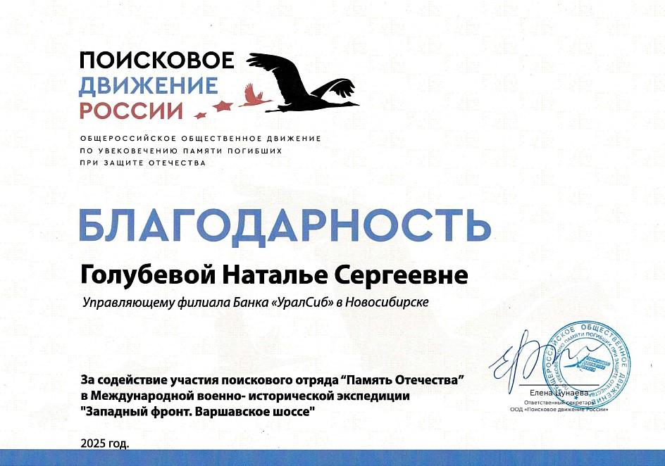 «Благодарность поискового движения России – это признание нашего скромного вклада в важную миссию, которую выполняет Поисковое движение России.Нам важно быть социально значимыми партнерами в регионе, где работает Банк Уралсиб. Мы организуем или активно участвуем в целом ряде социальных и патриотических проектов и программ. Мы и в дальнейшем будет поддерживать такие инициативы», – отметила Исполнительный директор, Управляющий филиалом ПАО «БАНК УРАЛСИБ» в Новосибирске Наталья Голубева.