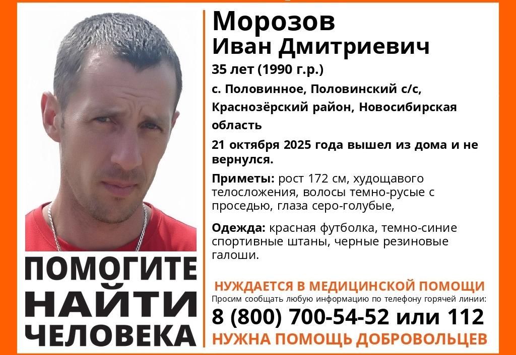 В селе Половинное в Краснозёрском районе Новосибирской области без вести пропал 35-летний Иван Морозов. Как сообщили в поисково-спасательном отряде (ПСО) «ЛизаАлерт», 21 октября 2025 года он вышел из дома и не вернулся.