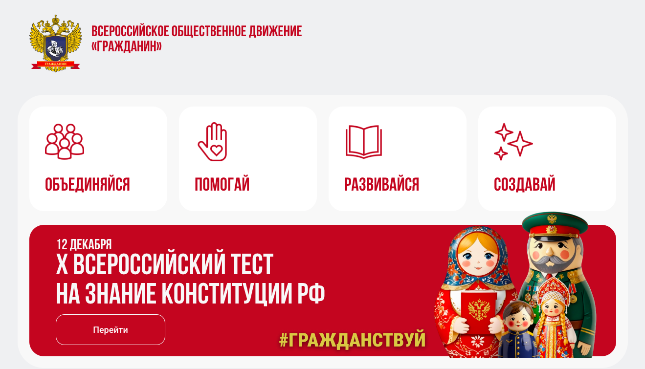 Общероссийское движение «Гражданин» ежегодно, в День Конституции 12 декабря, организует масштабную проверку знания главного документа государства. В текущем году эта инициатива проводится уже в десятый раз. За все время реализации проекта в нем приняли участие около 8 миллионов человек. Жители Новосибирской области приглашаются к участию в акции, а наиболее успешные участники тестирования получат награды от партнеров проекта.