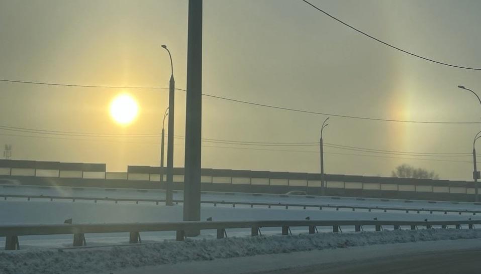 Солнечное гало было замечено в Новосибирске рано утром. Фотографии появились в паблике АСТ-54. Необычное природное явление появляется, когда соединяются три фактора — яркое солнце, крепкий мороз и высокая влажность.