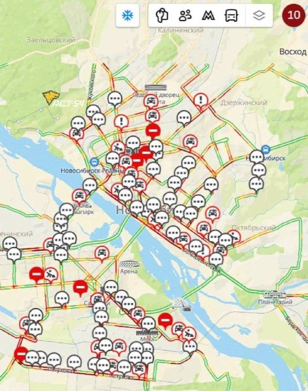 Сильные заторы зафиксированы на подъездах к мостам, Красном проспекте, улицах Большевистской, Ипподромской, Станционной и в районе железнодорожного вокзала. Движение осложняют ДТП и дорожные работы, из-за чего скорость потока на многих участках минимальная.
