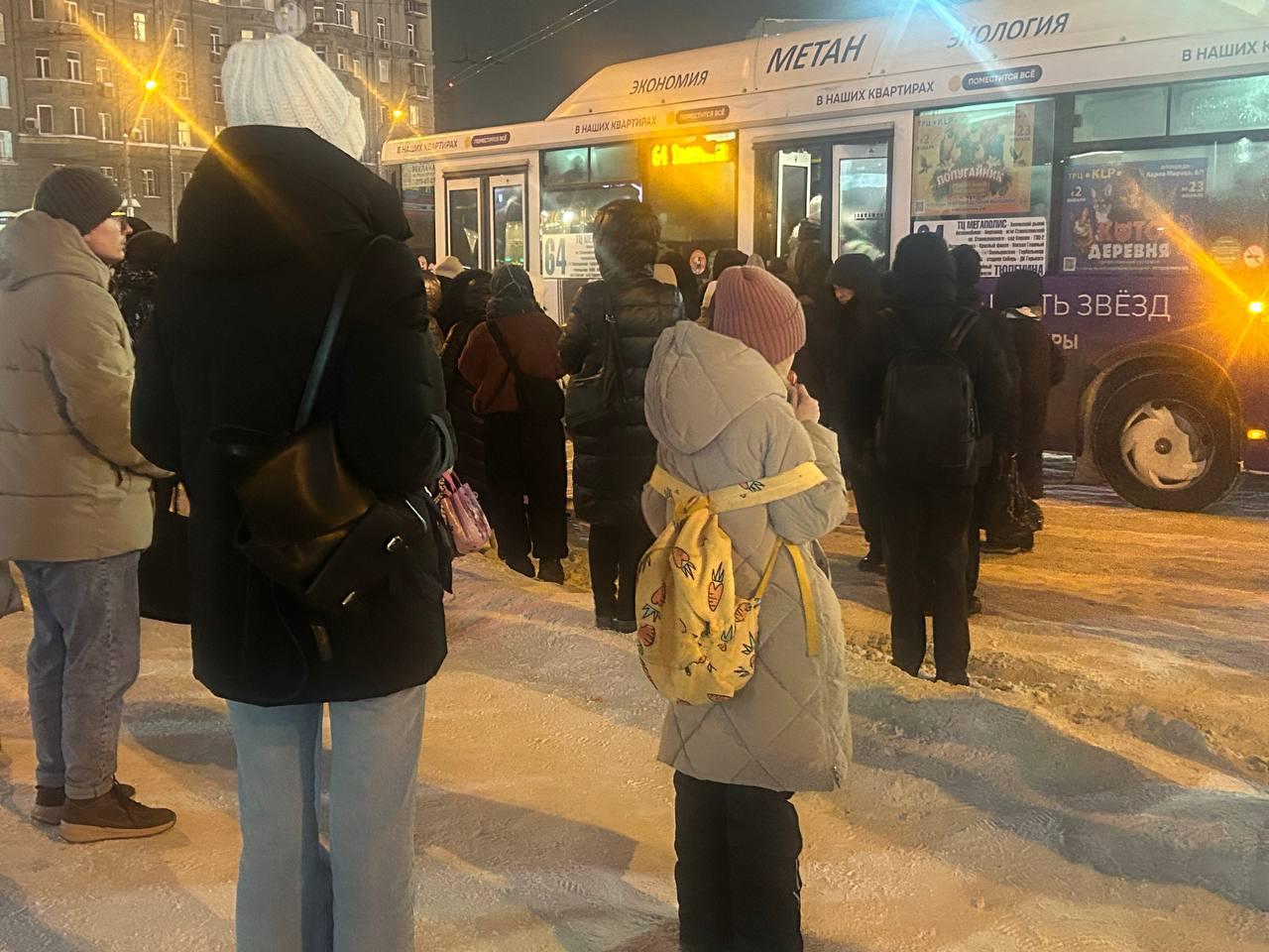 В Новосибирске из-за сильного мороза на автобусной остановке образовалась большая очередь.