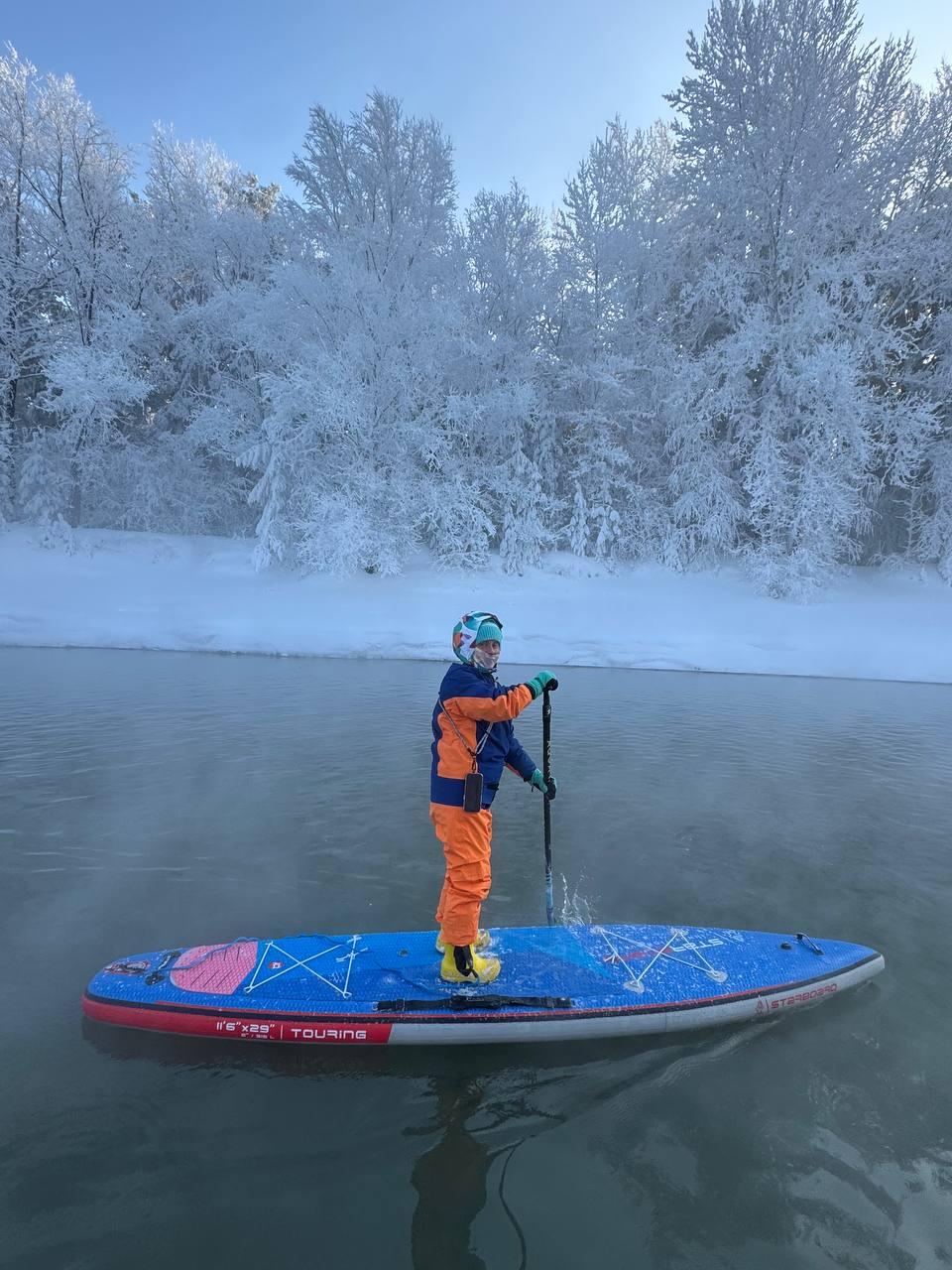 Группа отважных новосибирцев устроила массовый заплыв на сапбордах в условиях экстремально низких температур. Сегодня, когда столбик термометра опустился до -26 градусов, любители активного отдыха решили проверить свои силы и насладиться красотой зимней Оби.