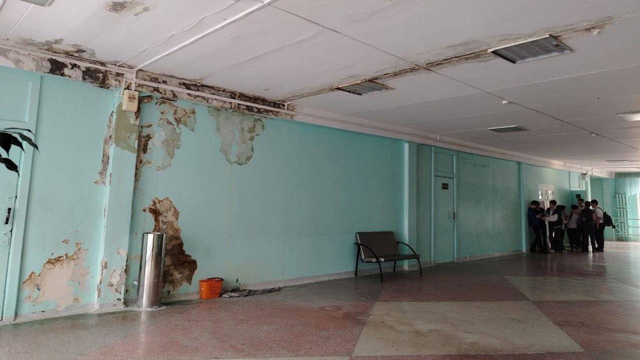 Проблема возникла 9 февраля после оттепели. В пострадавших классах занятия временно отменили: в помещениях слышна капель, осыпается штукатурка, на стенах появилась плесень.