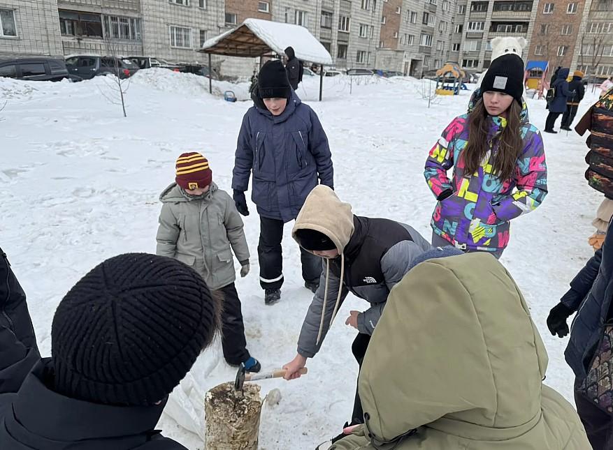 Двор на улице Владимировской превратился в настоящий центр притяжения: для детворы работала ледяная горка, с которой визг и смех не стихали ни на минуту, а взрослые и дети поочередно и с азартом мерялись силой в перетягивании каната. Под звуки гармони и веселые крики «Взяли!» канат ходил ходуном, не желая уступать ни одной из сторон.
