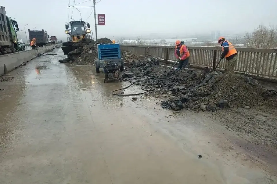 Сейчас специалисты разбирают монолитный цоколь барьерного ограждения и готовятся к снятию асфальта на крайней правой полосе, соседней с ней, а также на тротуаре в сторону правого берега.