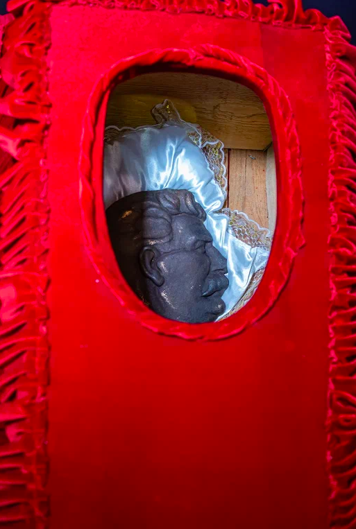 Однако на этом сюрпризы для гостей выставки не закончились. Фотограф Сиб.фм, работающий на месте событий, запечатлел еще один весьма специфический объект — скульптурное изображение революционера, государственного деятеля Иосифа Сталина, помещенное в гроб, обитый красной тканью с оборками.