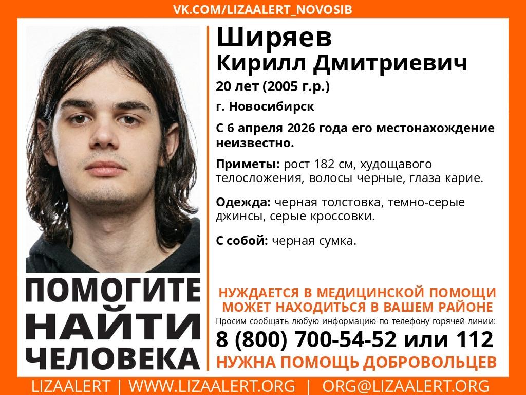 В Новосибирске продолжаются поиски двадцатилетнего Кирилла Дмитриевича Ширяева. Молодой человек бесследно исчез, и с 6 апреля 2026 года о его судьбе и местонахождении нет абсолютно никаких сведений. К розыску подключились волонтёры поисково-спасательного отряда «ЛизаАлерт», которые распространили ориентировку с приметами пропавшего.